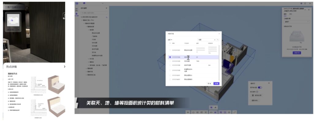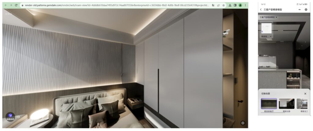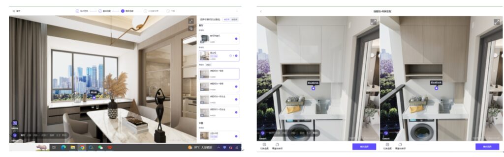 面向地产甲方、精装总包方、小业主方,提供VR资源选配、场景方案实时渲染,选配材料精准入户,实现定制精装项目从方案策划、成本测算、VR营销、加载选配、合同下单、采购招标、精准入户、现场管理、验收维保等全过程数字化应用。